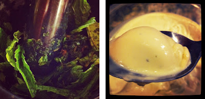 kyle wanted to try out my new kitchenaid ice cream maker attachment with this bourbon mint ice cream from gq. i tried out a vanilla recipe with fresh raspberries and chocolate chips first a few weeks ago (i'll post some details later), and it worked pretty well, so we knew we could move on to bigger and better things. this recipe has a lot of mint -- all the leaves from my mint plant plus some store bought -- and 1/4 cup of bourbon. and it tastes like gum. i love it, but if you don't want your ice cream tasting on the same level as toothpaste, maybe don't go for this one.